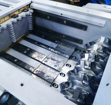 Переработка начинается с загрузки бункера пластиковыми отходами. В одновальных измельчителях гидравлический пресс подает материал к рабочему валу, что гарантирует полную переработку пластика, в том числе и тех частей, которые могут оказаться на поверхности без дополнительного толчка. Устройства с двумя валами обычно обходятся без гидравлического пресса, так как сами способны эффективно перемалывать материал.
