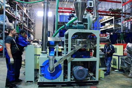 Полученные после дробления частицы насыпают в приемный бункер. С помощью встроенной в корпусе турбины материал продвигается во вращающийся ротор мельницы. Центробежная сила, заданная электродвигателем, отбрасывает полимерные частицы в камеру измельчения.